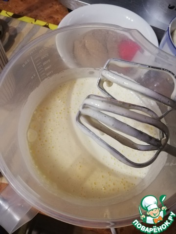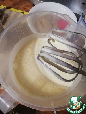 • Яйца взбить с сахаром до побеления и увеличения в объёме в несколько раз.