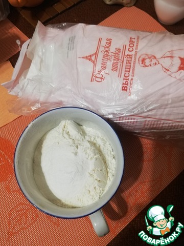 Муку просеять с разрыхлителем. Я использую муку ТМ "Французская штучка" высшего сорта. Выпечка получается просто бесподобной!