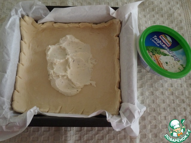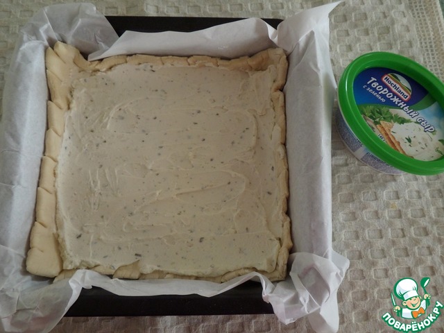 Поверх теста выкладываем творожный сыр с зеленью ТМ "Hochland". -