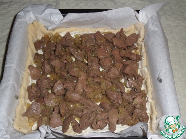 Затем поверх сыра выкладываем обжаренную печень. Равномерно распределяем.