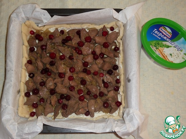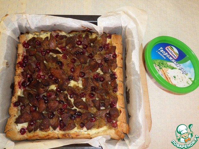Быстрый в приготовлении пирог на основе слоеного теста с творожным сыром с зеленью и обжаренной печенью. Ягоды клюквы отлично дополняют и подчеркивают вкус основных составляющих пирога. Эта выпечка универсальна - и на праздничный стол хороша, и в будни!