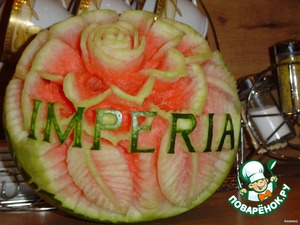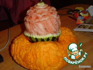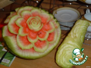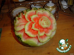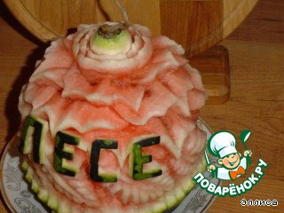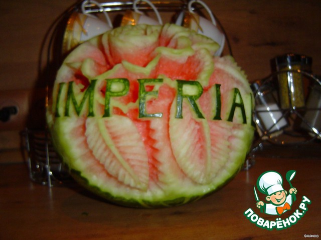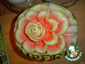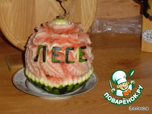 На примере этого арбуза хорошо видно,как вырезанные цветы и листья на арбузе прекрасно сочетаются с надписями.