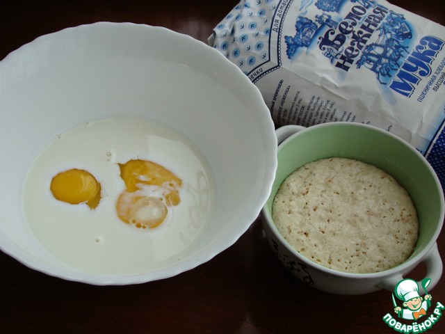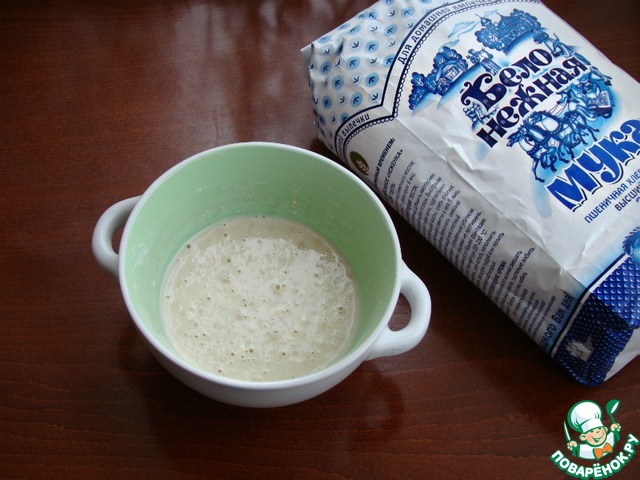 • В первую очередь активируем дрожжи. Для этого смешаем в миске половину нормы теплого ( но не горячего) молока, сухие дрожжи, половину нормы сахара и всыпать 3 ст. л. муки ТМ "Бело- нежная" из общего количества.