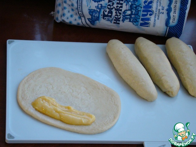 • Каждый кусочек теста, раскатать в овал и на один край по всей длине, распределить начинку из остывшего к этому времени, апельсинового курда.