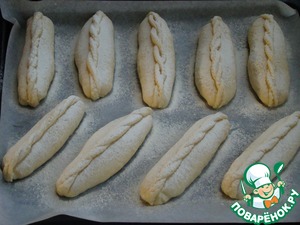 • Готовые батончики уложить на противень и смазать молоком. Из теста нарезать тонкие полоски, скрутить спиралью и уложить поверх батончиков или украсить по- своему вкусу. Так как сейчас зима, мне захотелось сделать выпечку с "зимним" акцентом. Поэтому сверху, булочки я слегка присыпала мукой, смешанной с ванилью.