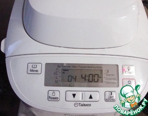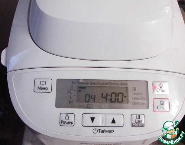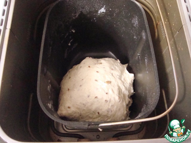 Поставить ведерко в хлебопечку, включить режим " Основной с изюмом". Время выпечки 4 часа.