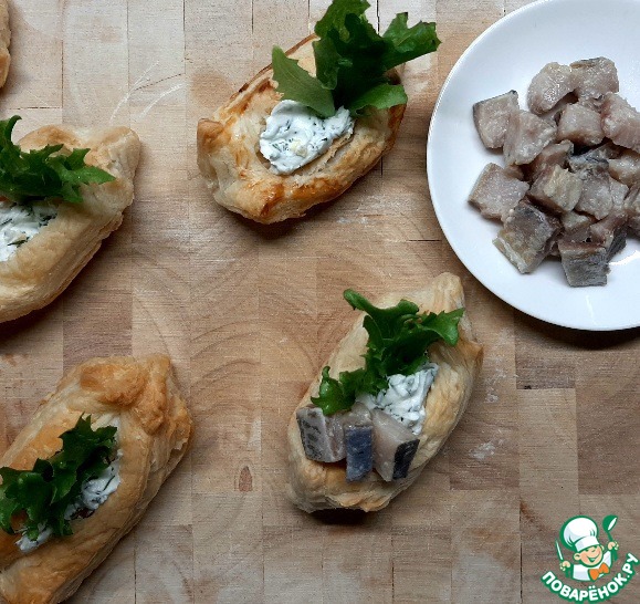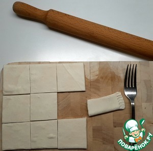 Слоёное тесто немного разморозить. Лист разрезать на 9 частей и каждую часть чуть раскатать.