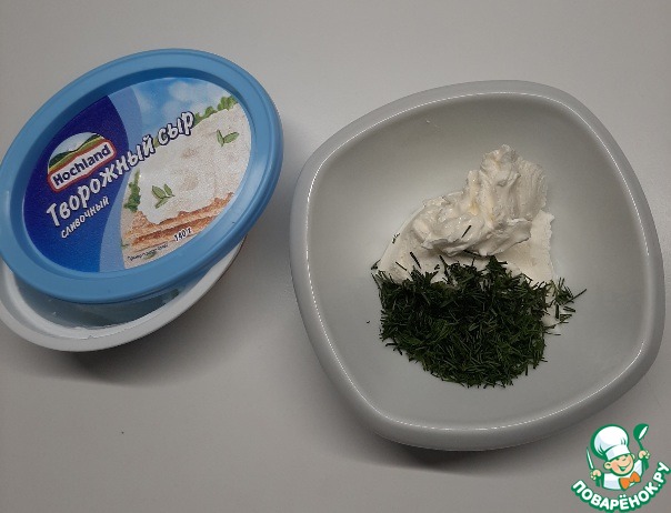 Укроп вымыть и обсушить. Творожный сыр (я использую Хохланд) смешать с мелко нарезанным укропом.