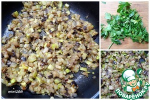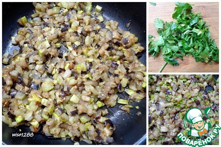 На растительном масле обжарить лук пару минут, добавить кабачок и баклажан, соль продолжить жарить еще минут десять. Петрушку нарезать и добавить к овощам, перемешать, остудить.
