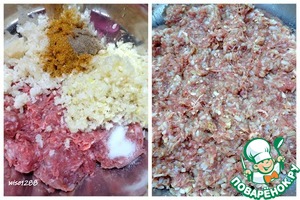 К фаршу добавить приправу, перец, соль, рис, лук с чесноком. Перемешать.