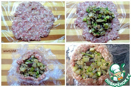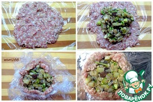 Разогреть духовку до 180 градусов. Сформировать мясную галету: на пищевой пленке распределить порцию мясного фарша лепешкой, на середину положить овощную начинку и с помощью пленки поднять края мясной лепешки (или другим удобным способом). Подровнять края.