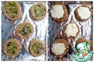 Переложить сформированные галеты на противень, смазанный растительным маслом. Всего получилось пять штук. Правленный сыр разложить сверху. Выпекать при температуре 180 градусов 30 минут.
