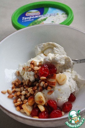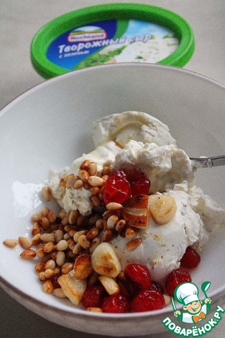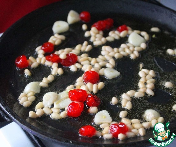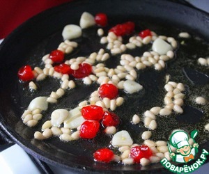 В сковороду кладём кусочек сливочного масла, нарезаем чеснок и добавляем туда же. Засыпаем в сковороду вишню и кедровые орешки, обжариваем на среднем огне несколько минут, пока орешки не подрумянятся.