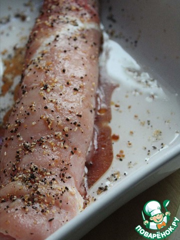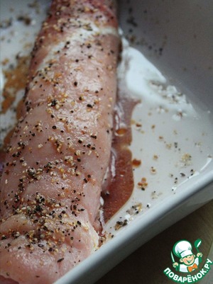 На мясо выкладываем начинку и сворачиваем рулет. Противень смазываем растительным маслом, выкладываем рулет и смазываем соевым соусом, затем посыпаем свежемолотым перцем.