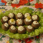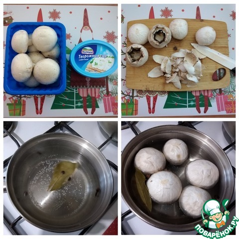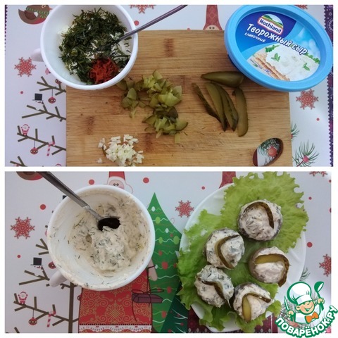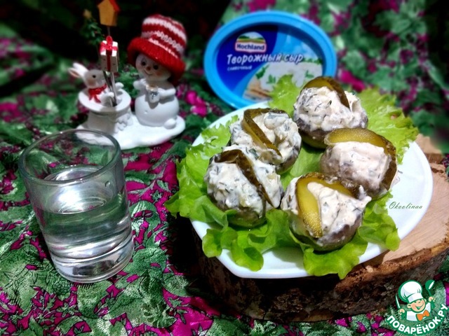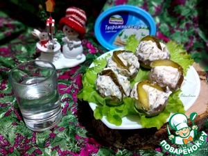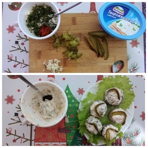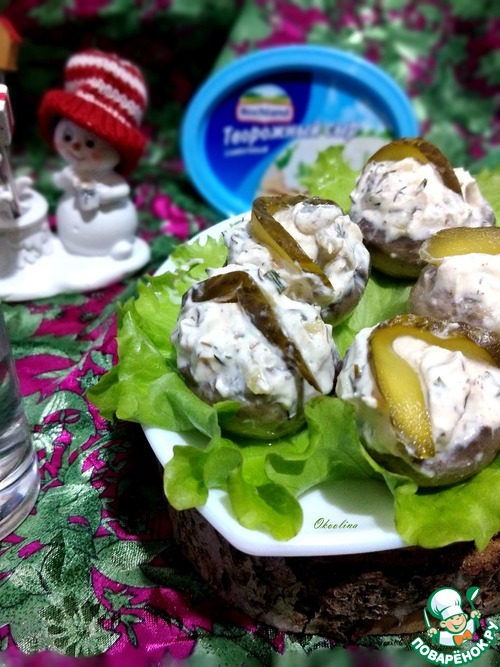 Закуска из маринованных шампиньонов с начинкой из творожного сыра с укропом и острым огурцом к крепким напиткам.