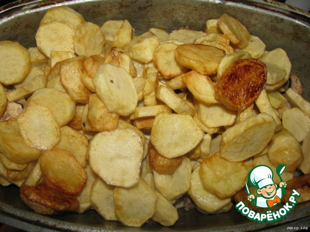Картофель очищаем, моем и нарезаем колечками, толщиной приблизительно 0,7мм. Картофель нужно обжарить. Я это делаю во фритюрнице (спасибо человечеству за изобретение бытовых и кухонных приборов!!!), а вот папа мой обжаривал просто на сковороде, маленькими порциями.