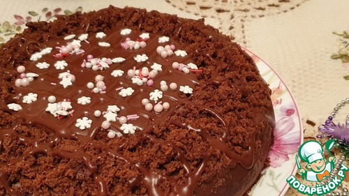 Крошкой присыпем вокруг корж, можно бока, если много крошки получилось, но в центр не надо класть, тут мы смажем глазурью.