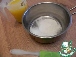 В кастрюлю кладем сахар, агар-агар и наливаем немного сока.