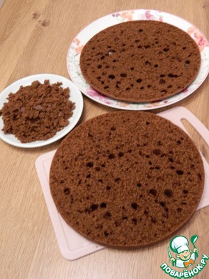 Разрезаем корж на две части, верхушку тоже немного срежем от мякоти, выровняем, так как нам понадобится крошка для украшения.