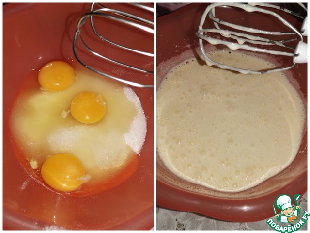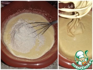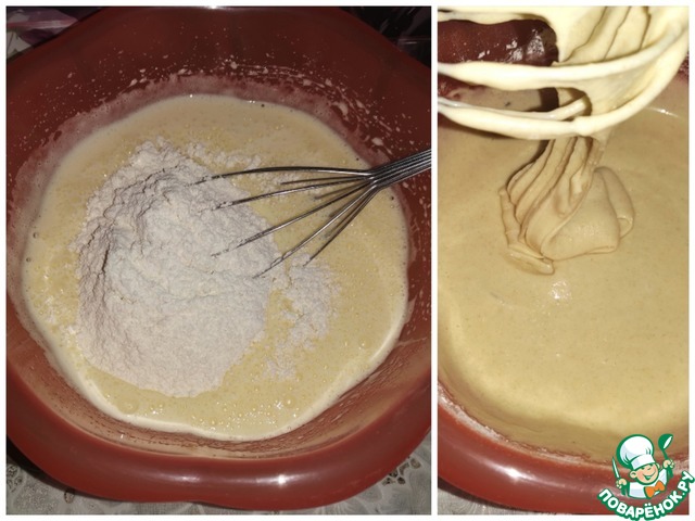 Соединить обе смеси :мучную и яичную. Тесто ароматное и густое, падает с венчика лентами.