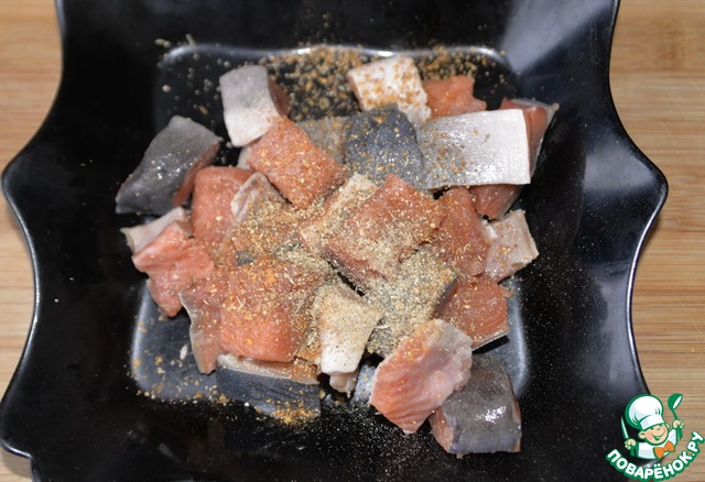 Рыбу чистим, у меня - горбуша, разделываем на филе, я кожу оставляю, вы - на своё усмотрение, режем кусочками 2 на 3 см. Маринуем рыбу в соли, соке лимона, приправе для рыбы и смеси перцев. -