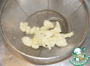 Берём цветную капусту. Если свежая, то разбираем на соцветия. Отвариваем в подсоленной воде. Если свежая, то 5 минут, если мороженная, то 2 минуты. Откидываем на дуршлаг.
