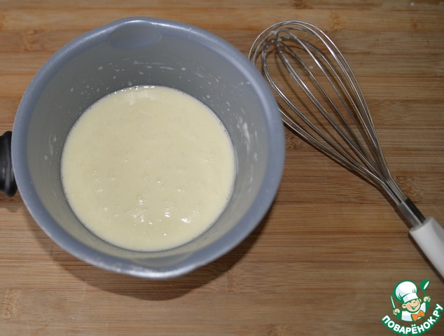 Готовим заливку. Сливки немного нагреваем, кладём в них плавленный сыр, размешиваем венчиком. Сливки нужны слегка подогретые, иначе сыр не растворится. У меня сыр плавленный Hochland.