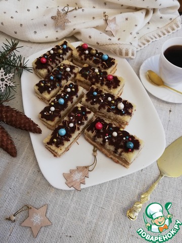 Даём пирогу полностью остыть. Обрезаем неровные края и нарезаем на порционные кусочки.