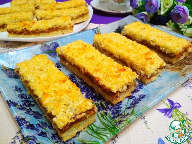 И поверх сгущёнки распределяем кокосовую массу.