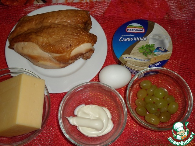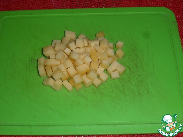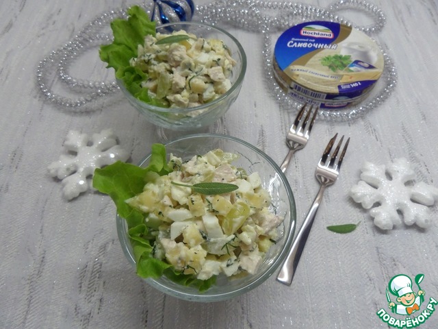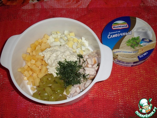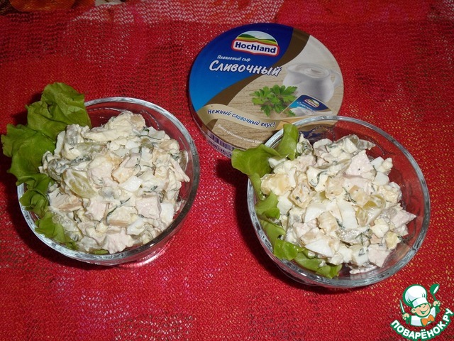 Для приготовления салатной заправки я буду использовать плавленый сыр ТМ"Hochland". Нам потребуется 2 кусочка.