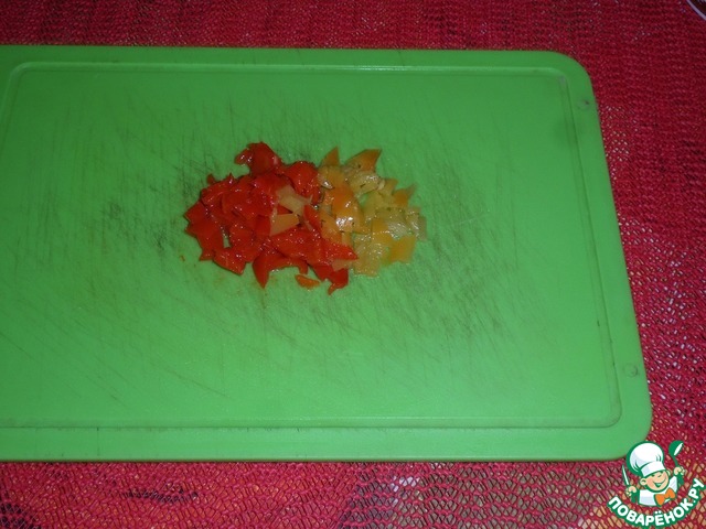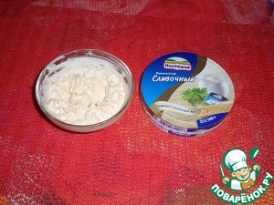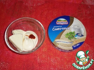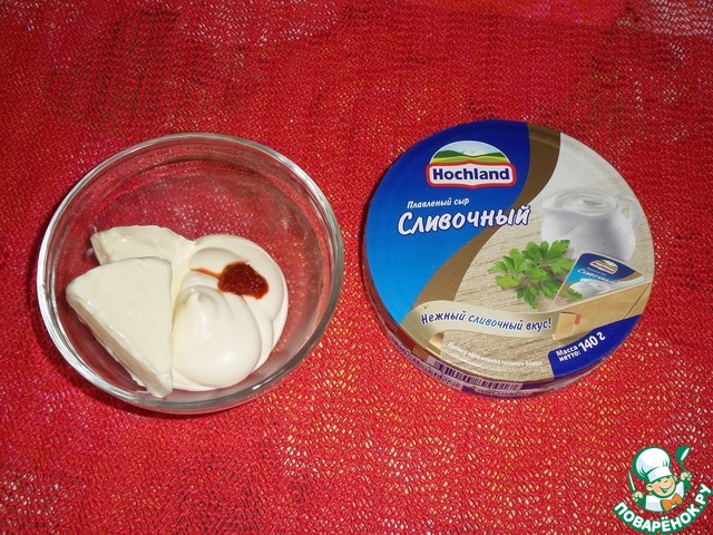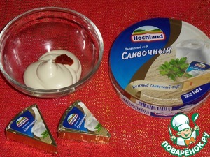 В чашечку выкладываем майонез, плавленый сыр TM"Hochland" и аджику.
