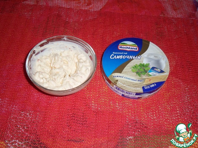 Для приготовления салатной заправки я буду использовать плавленый сыр TM"Hochland". Мне потребуется 2 кусочка.