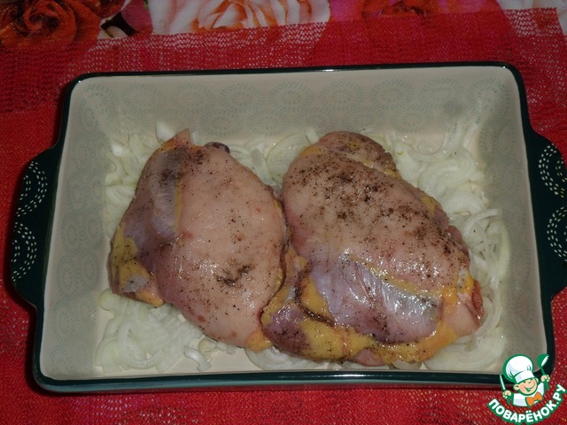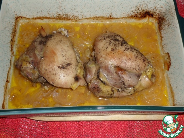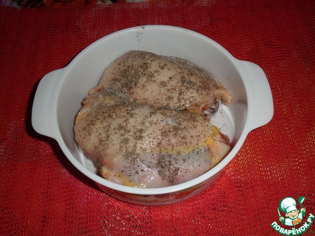 Вынимаем форму из духовки. Густым соусом поливаем куриное мясо. Возвращаем в духовку еще на 5 минут. Затем вынимаем форму из духовки.