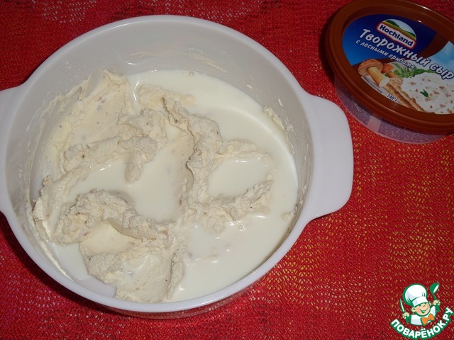 Для приготовления соуса я буду использовать творожный сыр с грибами ТМ"Hochland". Мне потребуется 1 баночка.
