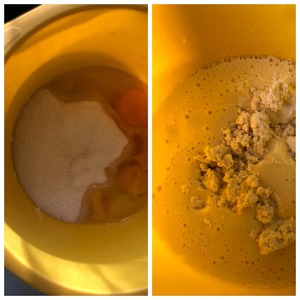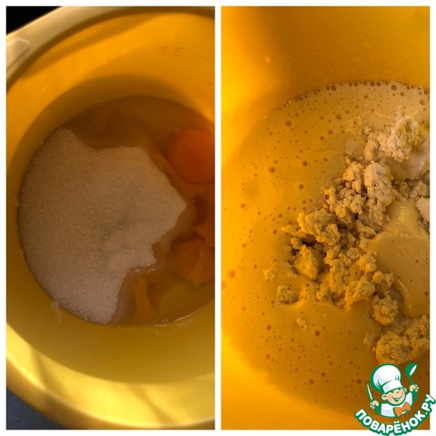 Яйца взбить с сахаром в пышную пену. Добавить творог и продолжать взбивать около минуты.