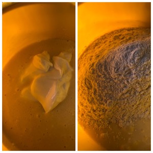 Выложить сметану и взбиваем секунд 30. Добавить муку и разрыхлитель. Взбить совсем немного.