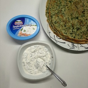 Вымытый и обсушенный укроп мелко нарезать и смешать с половиной творожного сыра. Намазать часть блинчиков.
