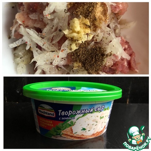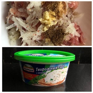 В фарш натереть лук на крупной терке, чеснок пропустить через пресс. Добавить соль, молотый перец, кориандр и творожный сыр. Тщательно вымесить фарш.