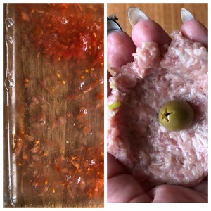 В форму для выпечки натереть на крупной терке помидор. Влить 100 мл кипячёной воды, добавить щепотку соли. Перемешать. Небольшой кусочек фарша расплюснуть на ладони и в центр выложить оливку. Защипнуть края, формируя фрикадельку.