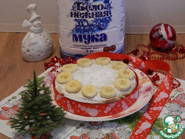 Присыпаем верх запеканки по желанию сахарной пудрой, украшаем кружочками бананов. Можно было не прокладывать бумагой, запеканка хорошо бы извлеклась и без нее, только края от бумаги получились немного неровными из за складочек.