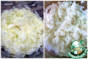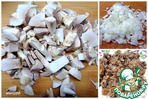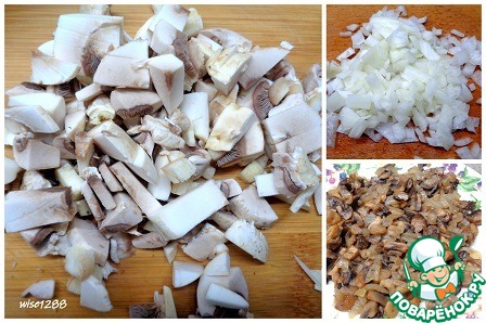 Для начинки шампиньоны и лук нарезать произвольно. Лук пожарить на растительном масле минуты три, добавить шампиньоны, посолить и продолжить жарить еще семь минут на среднем огне. Начинка готова.
