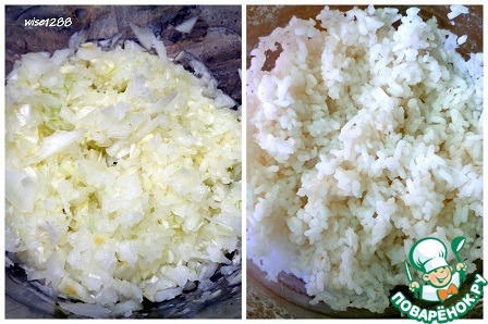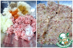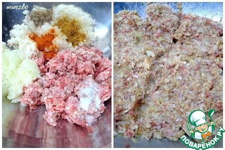 В мясной фарш добавить рис, лук, приправу, паприку, соль и черный перец. Перемешать.