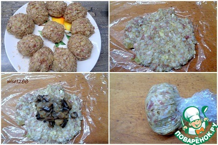 Сформировать тефтели с начинкой: поделить приготовленный фарш для тефтелей на порции. Каждую порцию фарша превратить в лепешку, на которую положить фарш, края соединить. Удобно это сделать с помощью пищевой пленки. Получилось десять заготовок.