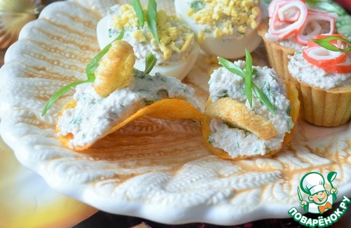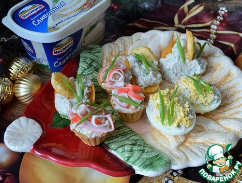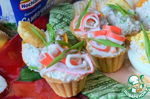 Подать в тарталетках, украсив крабовыми палочками. Или на чипсах с сухариками. Ещё вариант - в белке варёного яйца, украсив желтком.