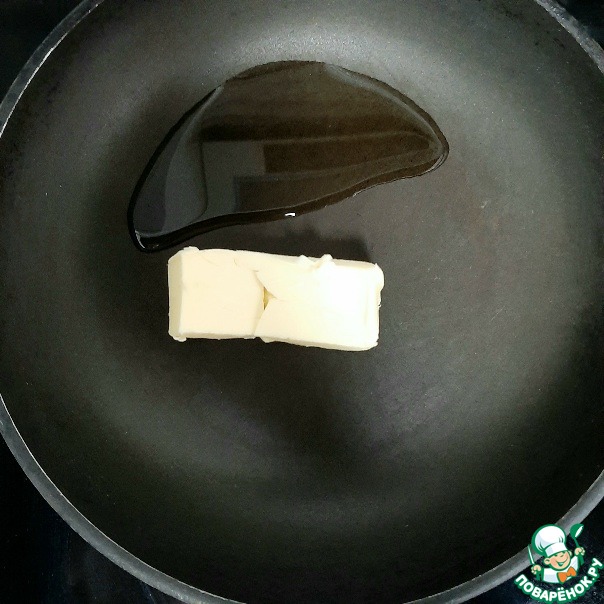 • Сливочное и оливковое масло растопить на сковороде. Когда масло начнёт пузыриться, всыпать паприку.
