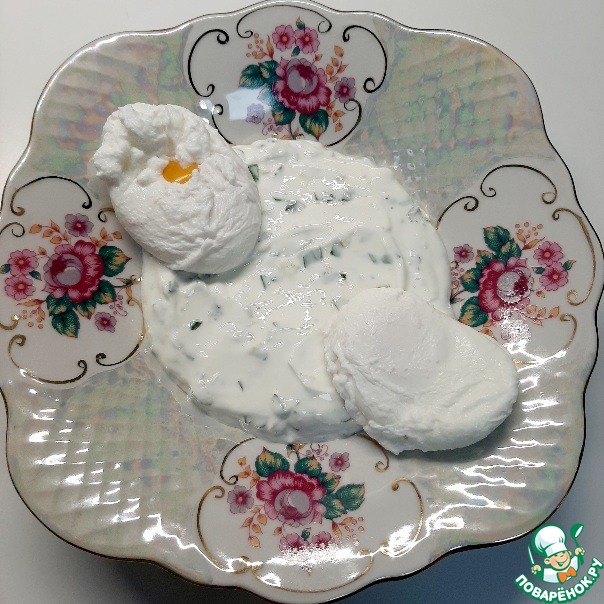 • Йогуртовую смесь разложить по двум тарелкам. Сверху поместить яйца-пашот.