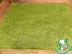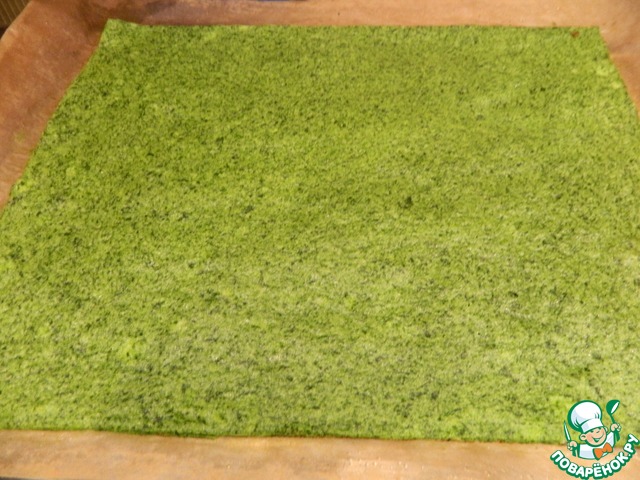 На противень застелим промасленную бумагу, выложим тесто, размазывая равномерно ложкой. У меня получился квадрат 30х30 см.