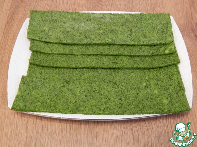 Готовый корж остудим, выровняем края и и разрежем на полоски, я разрезала на 5 полосок.