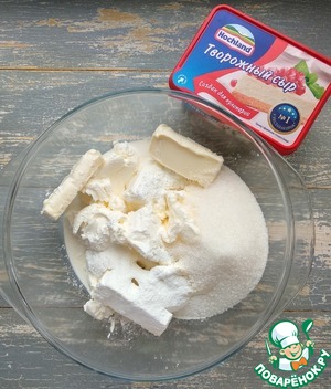 В ёмкости соединить творожный сыр, размягченное сливочное масло, сахар, крахмал, соль, сливки. Хорошо перемешать до однородной массы.
