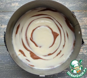 Затем поочередно выкладываем массу, сначала одну столовую ложку белого слоя, сверху одна столовая ложка шоколадного слоя и т. д. При необходимости потрести форму вверх-вниз, вправо-влево, чтобы тесто равномерно распределялось по форме.
